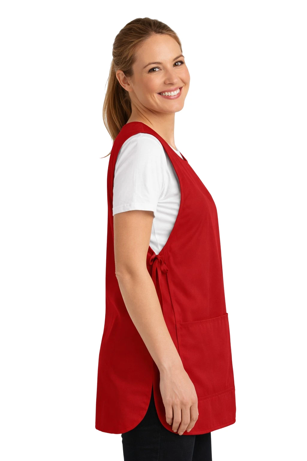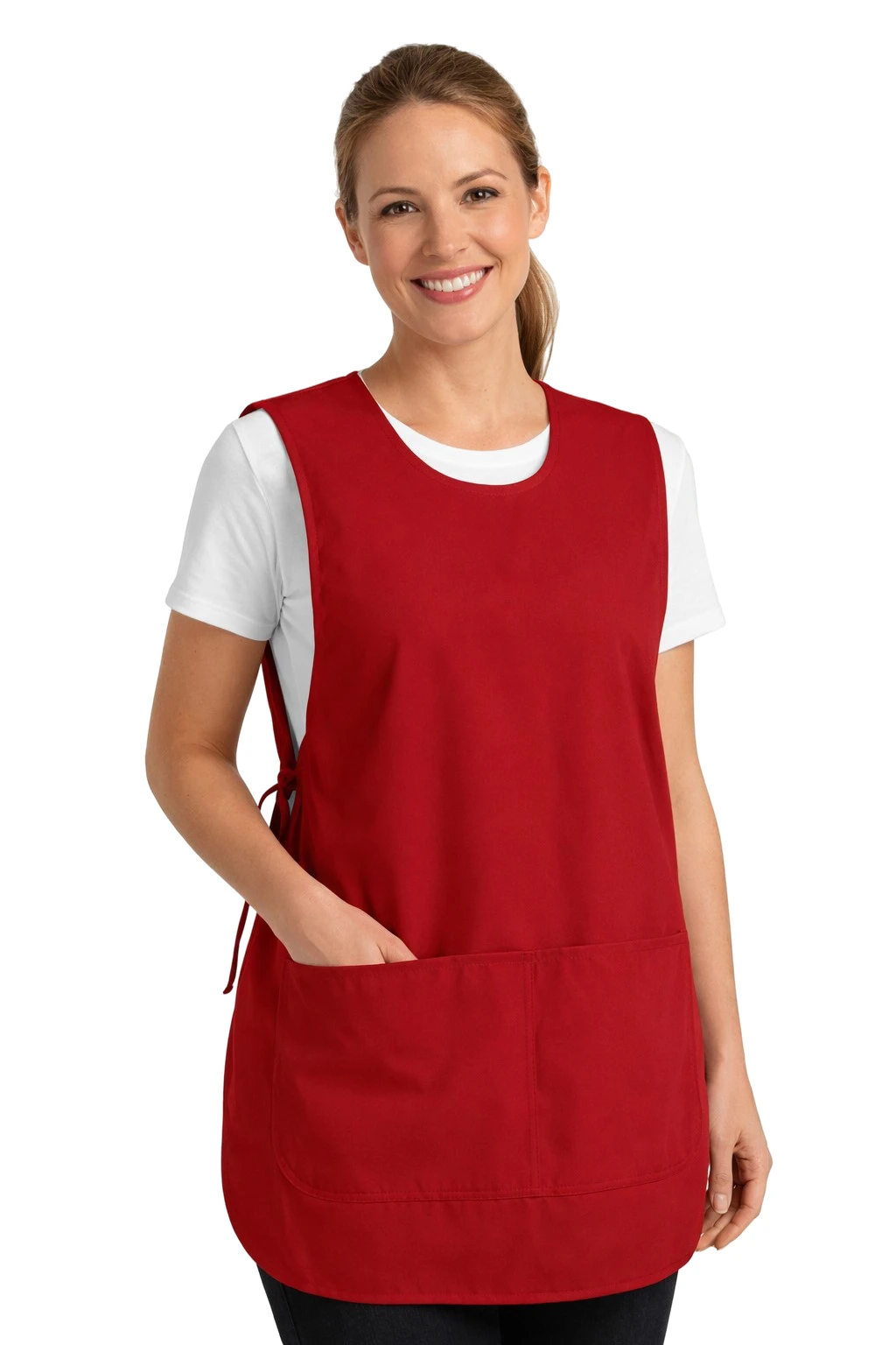 Fartuch został zaprojektowany z myślą o codziennym użytkowaniu. Szeroki dekolt zapewnia wygodę, a zaokrąglone wykończenie dołu zwiększa swobodę ruchów. Dodatkowo wzmocnione, obszyte szwy wpływają na trwałość produktu, co ma znaczenie przy intensywnej pracy.