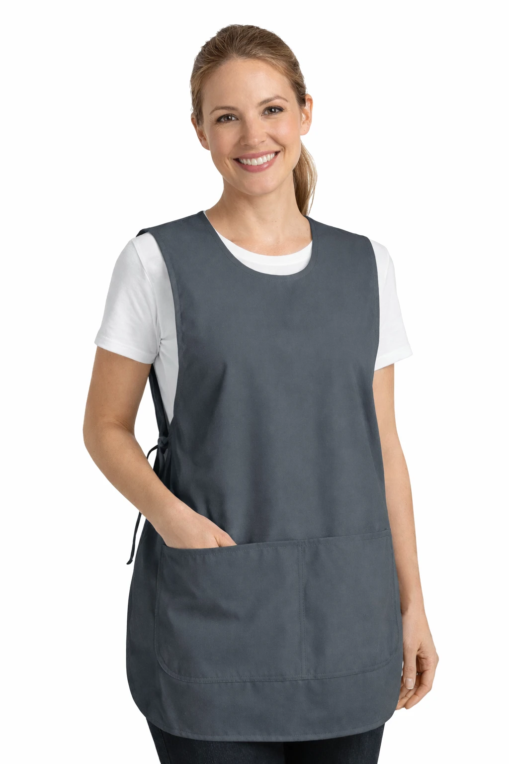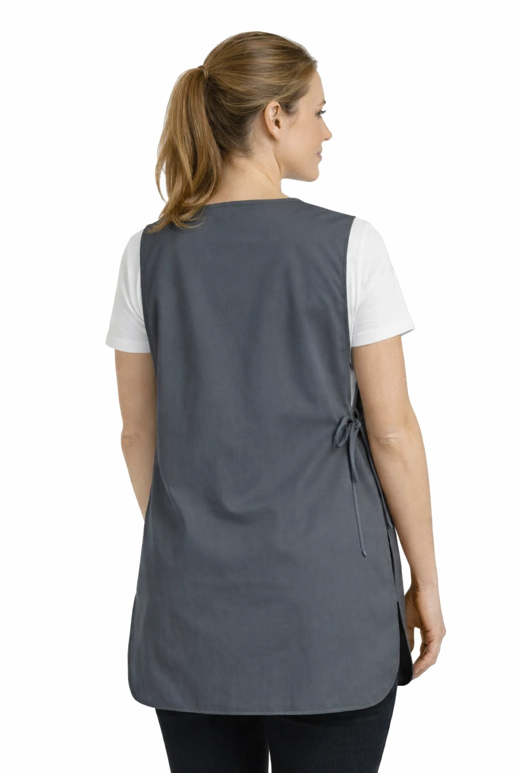 Fartuch został zaprojektowany z myślą o codziennym użytkowaniu. Szeroki dekolt zapewnia wygodę, a zaokrąglone wykończenie dołu zwiększa swobodę ruchów. Dodatkowo wzmocnione, obszyte szwy wpływają na trwałość produktu, co ma znaczenie przy intensywnej pracy.