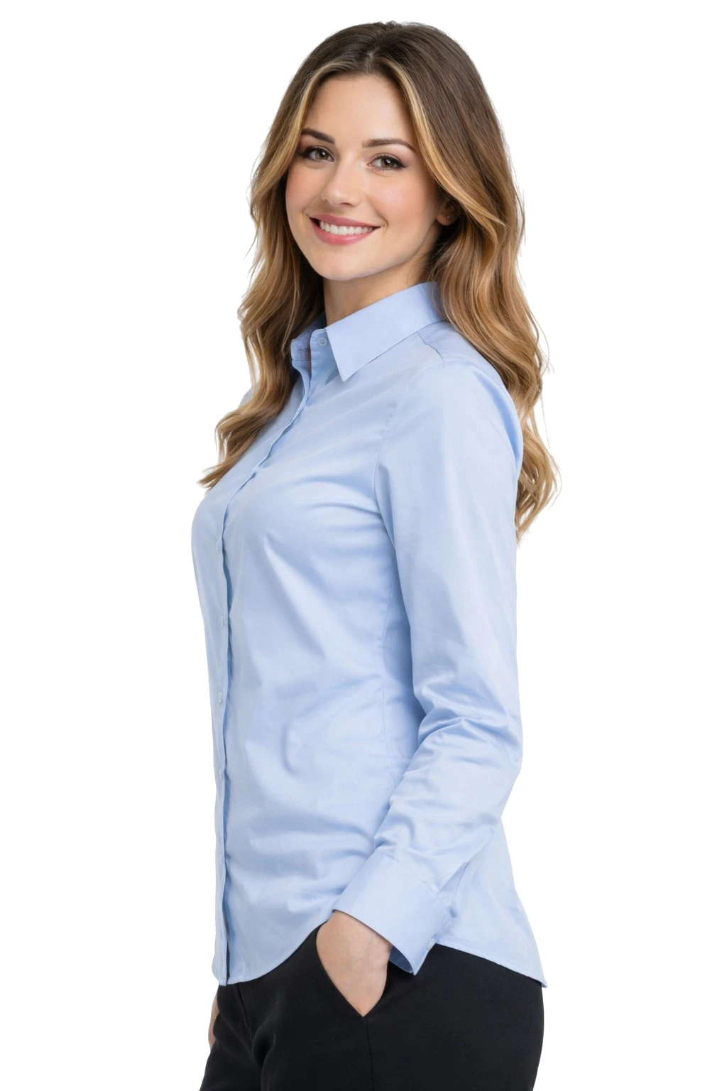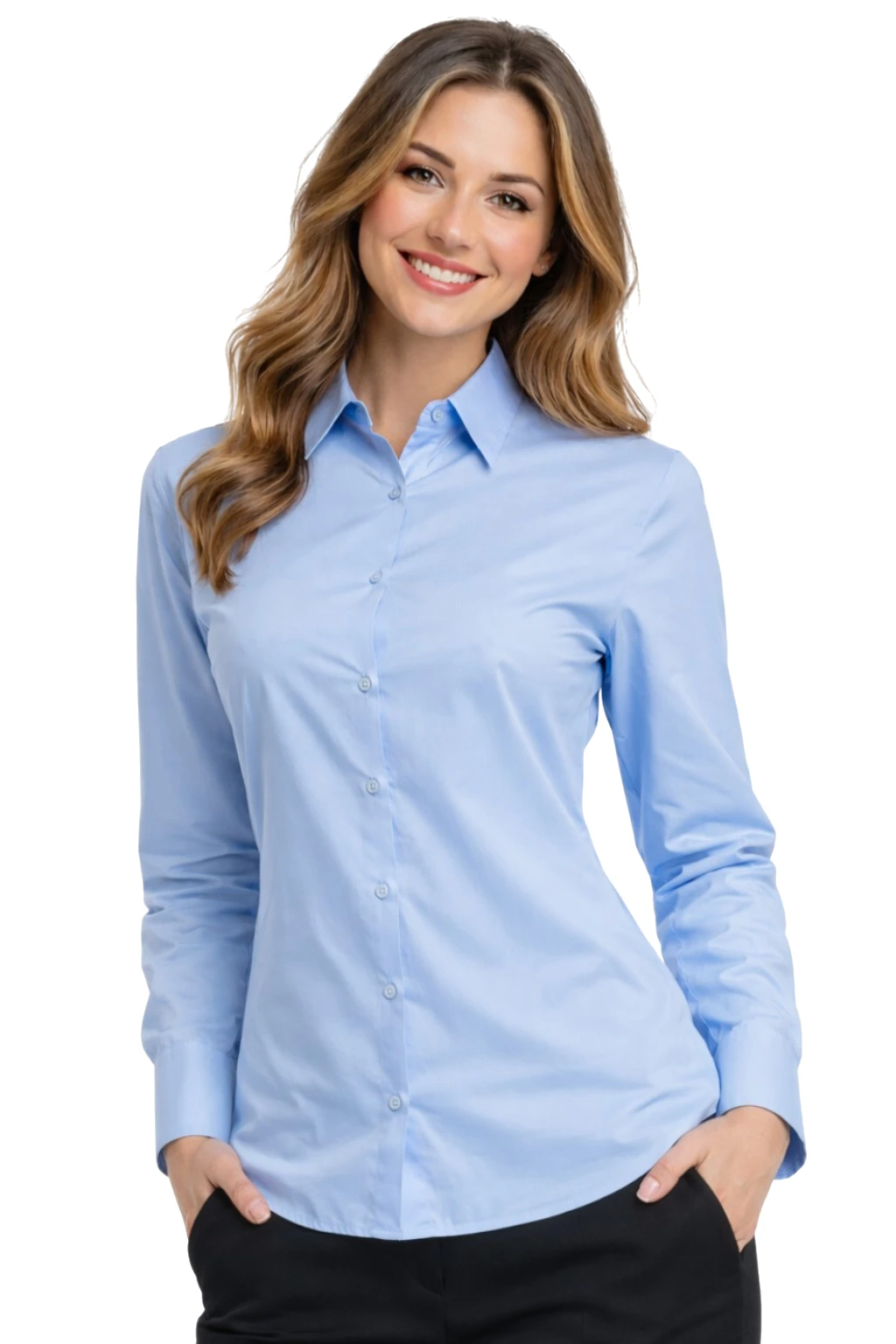 Damska koszula niebieska z długim rękawem to klasyczny i elegancki model stworzony z myślą o profesjonalnym wizerunku w środowisku biznesowym. Doskonale sprawdzi się jako koszula firmowa dla menedżerek, pracownic biurowych, recepcji oraz zespołów obsługi klienta.