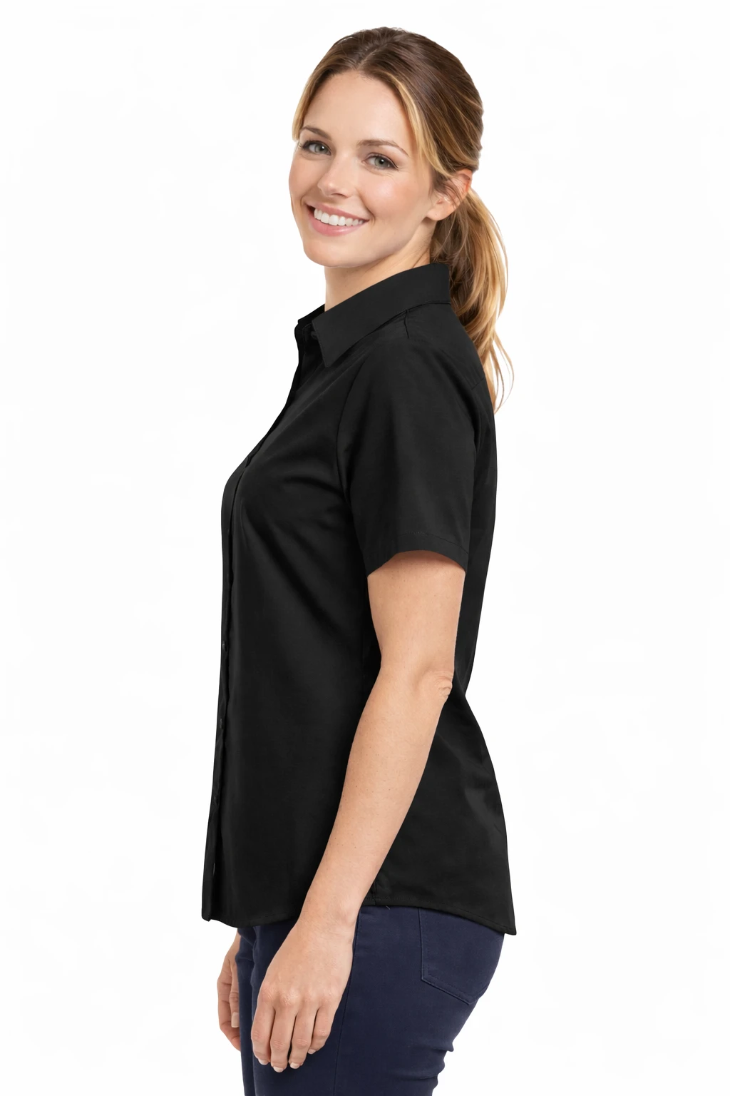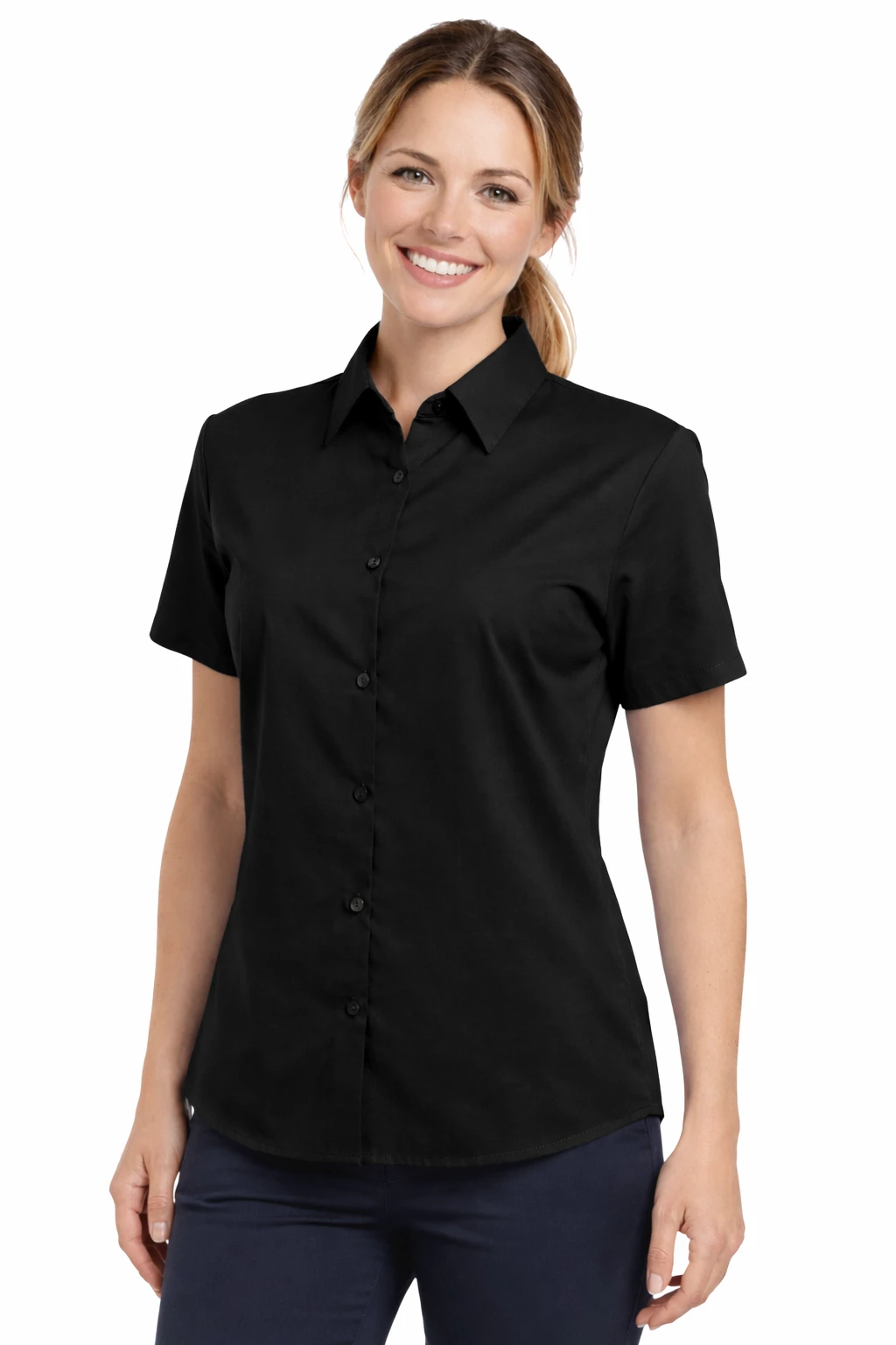 Damska koszula czarna z krótkim rękawem to klasyczny model stworzony z myślą o profesjonalnym wizerunku w środowisku biznesowym. Doskonale sprawdzi się jako koszula firmowa dla pracownic biur, recepcji, hoteli, gastronomii oraz działów obsługi klienta.