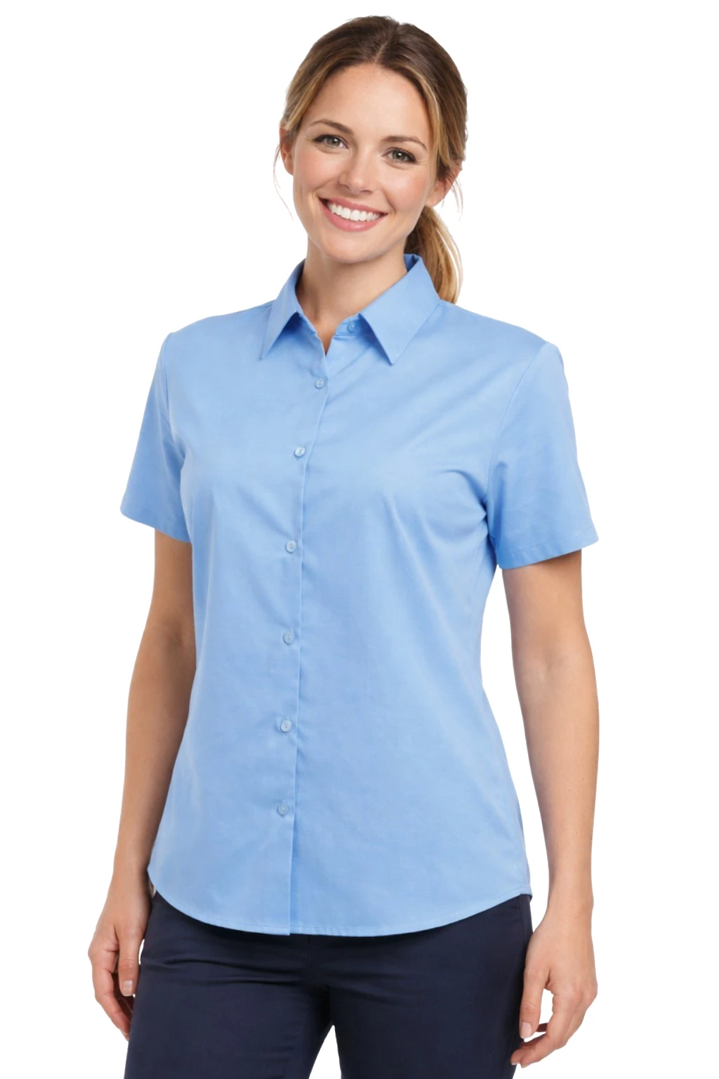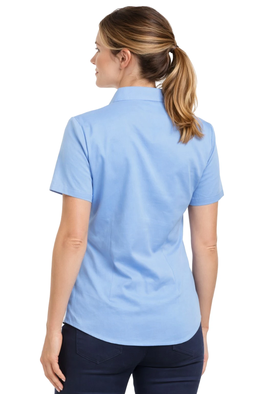 Damska koszula niebieska z krótkim rękawem to klasyczny model stworzony z myślą o profesjonalnym wizerunku w środowisku biznesowym. Doskonale sprawdzi się jako koszula firmowa dla pracownic biur, recepcji, hoteli, gastronomii oraz działów obsługi klienta.