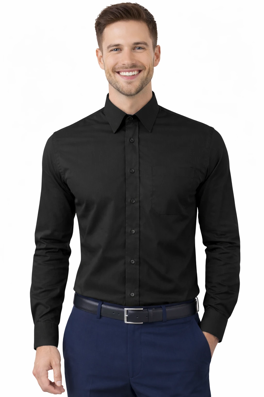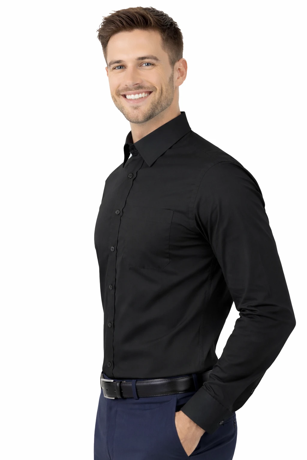 Koszula męska czarna z długim rękawem to klasyczny i elegancki model stworzony z myślą o profesjonalnym wizerunku w środowisku biznesowym. Doskonale sprawdzi się jako koszula firmowa dla kadry zarządzającej, dyrektorów, menedżerów oraz pracowników wymagających nienagannego wyglądu.