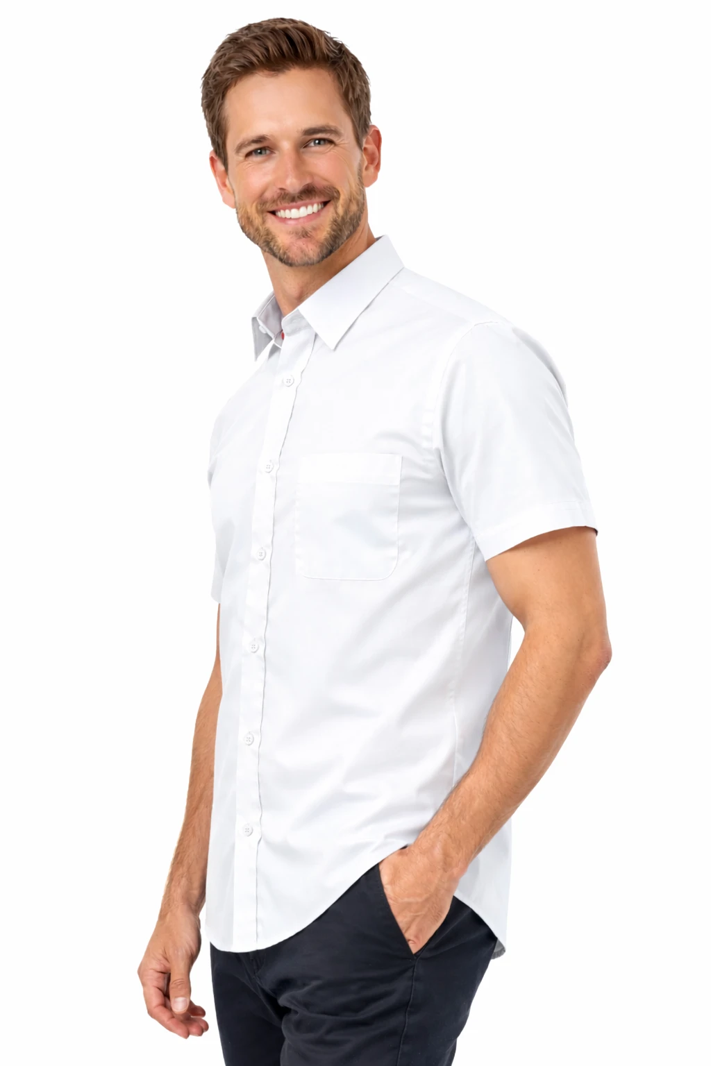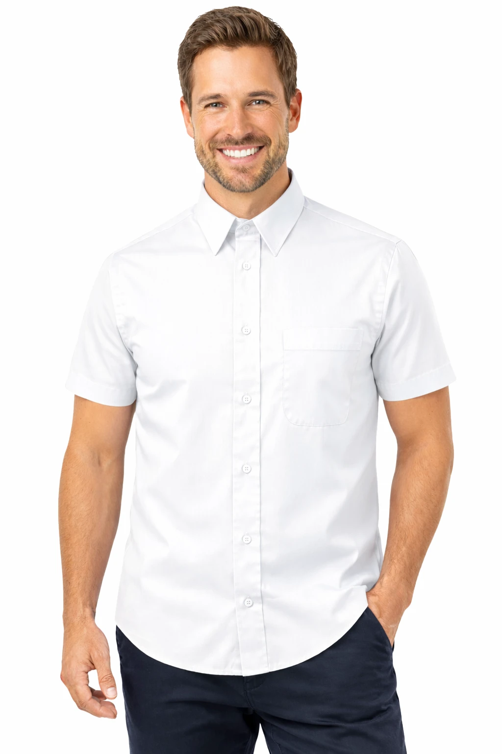 Koszula męska biała z krótkim rękawem to elegancki i funkcjonalny model stworzony z myślą o profesjonalnym wizerunku w środowisku biznesowym. Doskonale sprawdzi się jako koszula firmowa dla kadry zarządzającej, pracowników biurowych, handlowców oraz zespołów obsługi klienta.