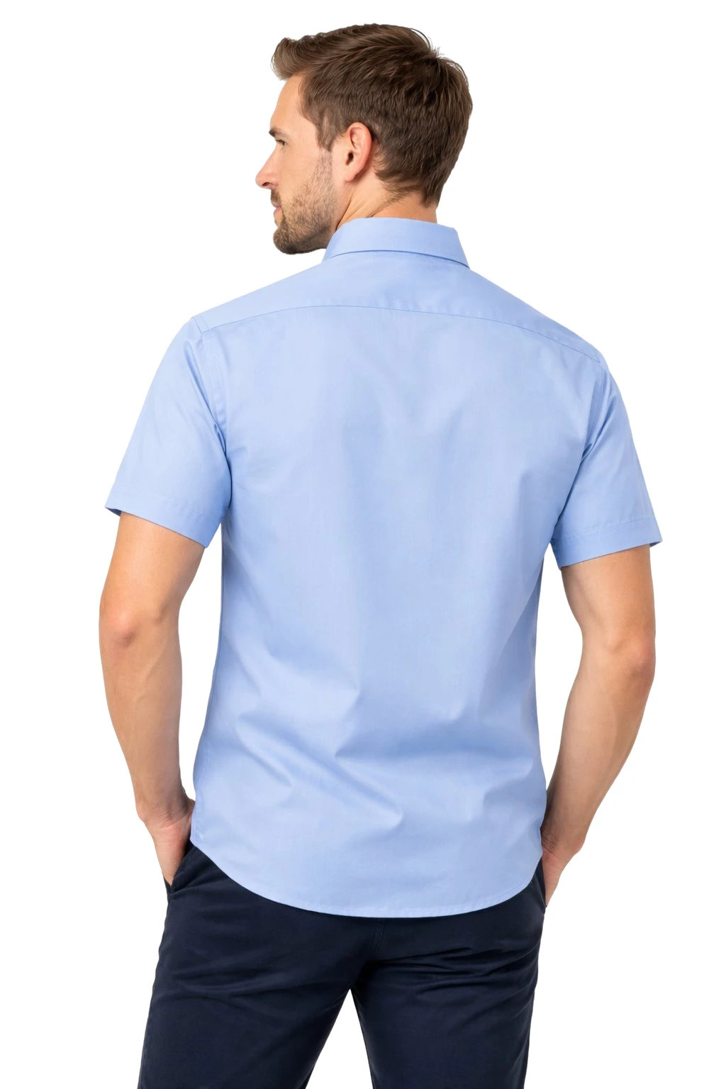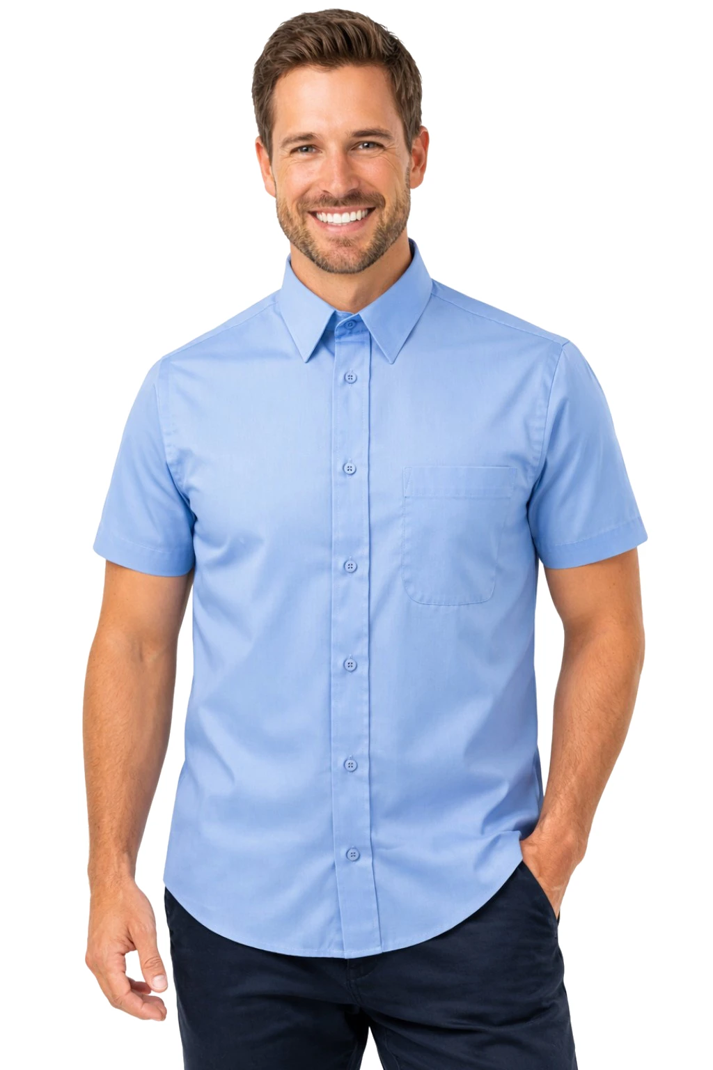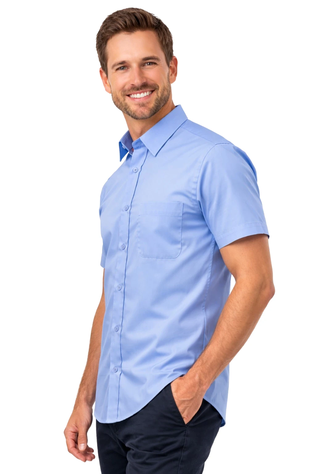 Koszula męska niebieska z krótkim rękawem to elegancki i funkcjonalny model stworzony z myślą o profesjonalnym wizerunku w środowisku biznesowym. Doskonale sprawdzi się jako koszula firmowa dla kadry zarządzającej, pracowników biurowych, handlowców oraz zespołów obsługi klienta.