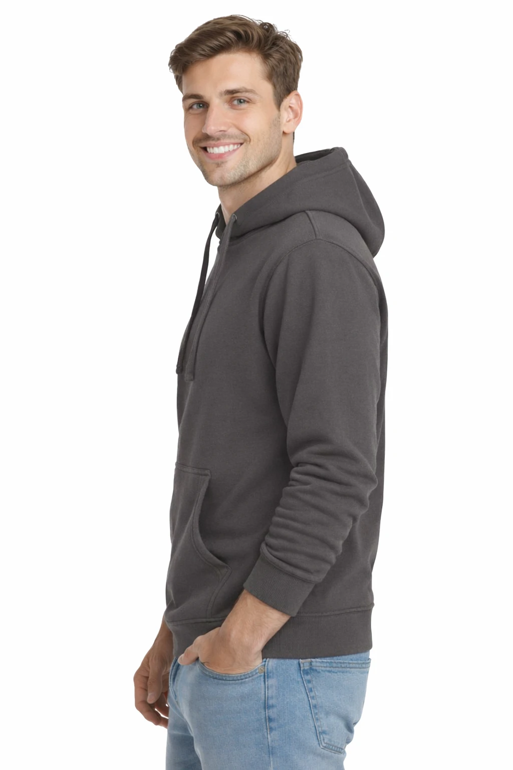 Męska bluza z kapturem w kolorze ciemno szarym to połączenie wygody, trwałości i uniwersalnego designu. Klasyczny krój oraz praktyczna kieszeń typu kangur sprawiają, że model doskonale sprawdza się zarówno w codziennym użytkowaniu, jak i podczas pracy. Regulowany kaptur ze sznurkiem zapewnia dodatkową ochronę przed chłodem i wiatrem.