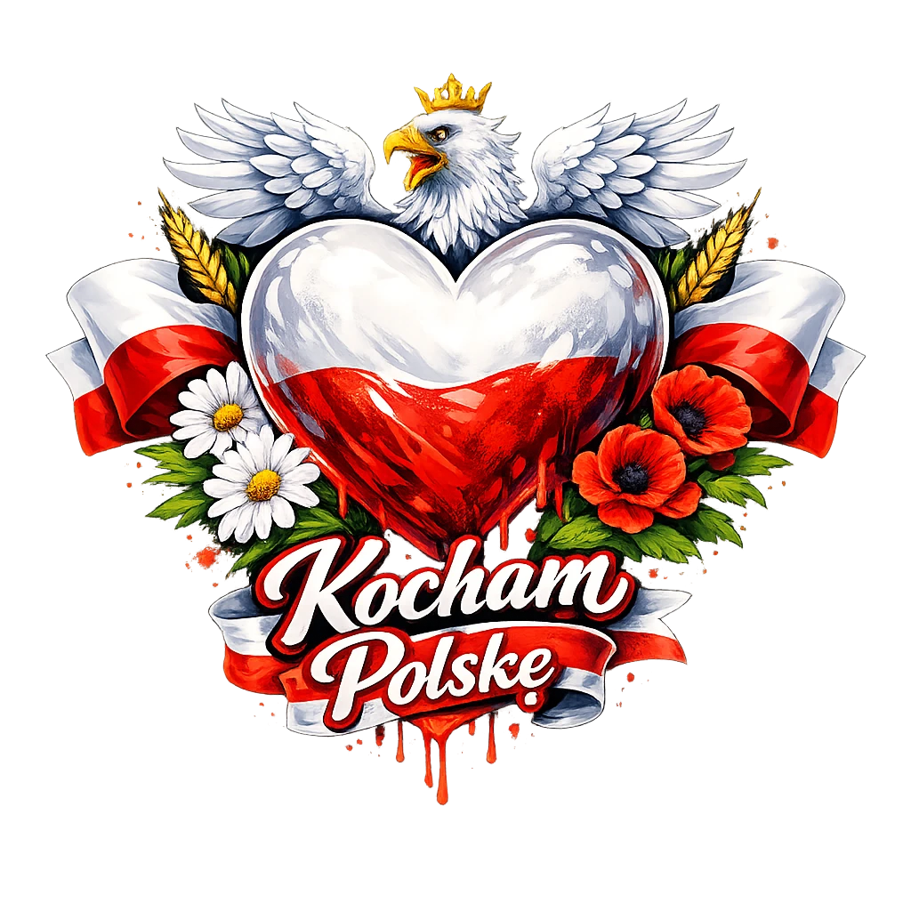 Na dole umieszczony jest stylizowany napis „Kocham Polskę”, który wzmacnia emocjonalny przekaz i spaja całość w efektowną kompozycję.