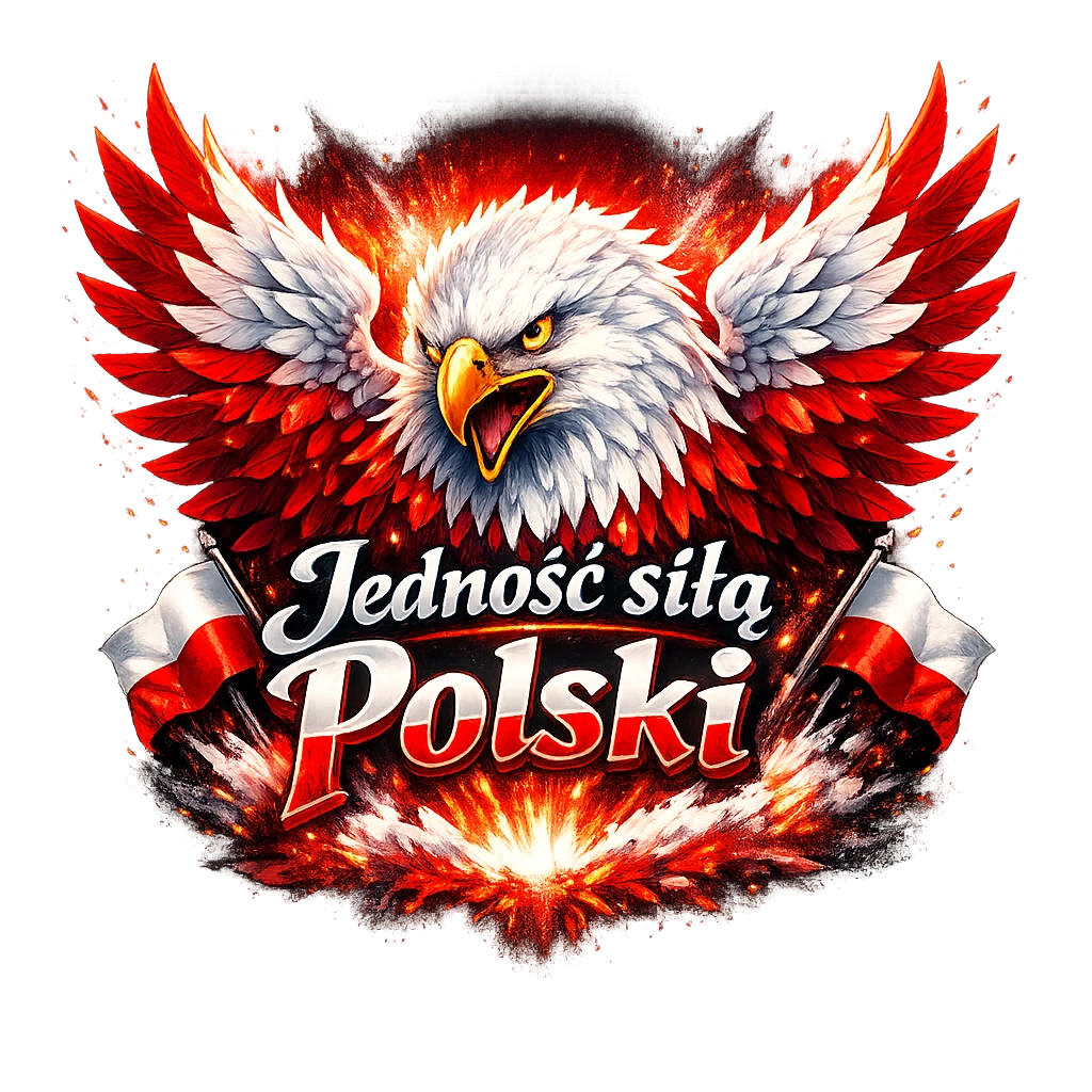 Pod orłem znajduje się wyrazisty napis „Jedność siłą Polski”, który stanowi silne przesłanie patriotyczne i symbol wspólnoty. Dodatkowe elementy, takie jak flagi Polski oraz efekt eksplozji światła, wzmacniają wizualny efekt i nadają koszulce unikalny, agresywny styl.